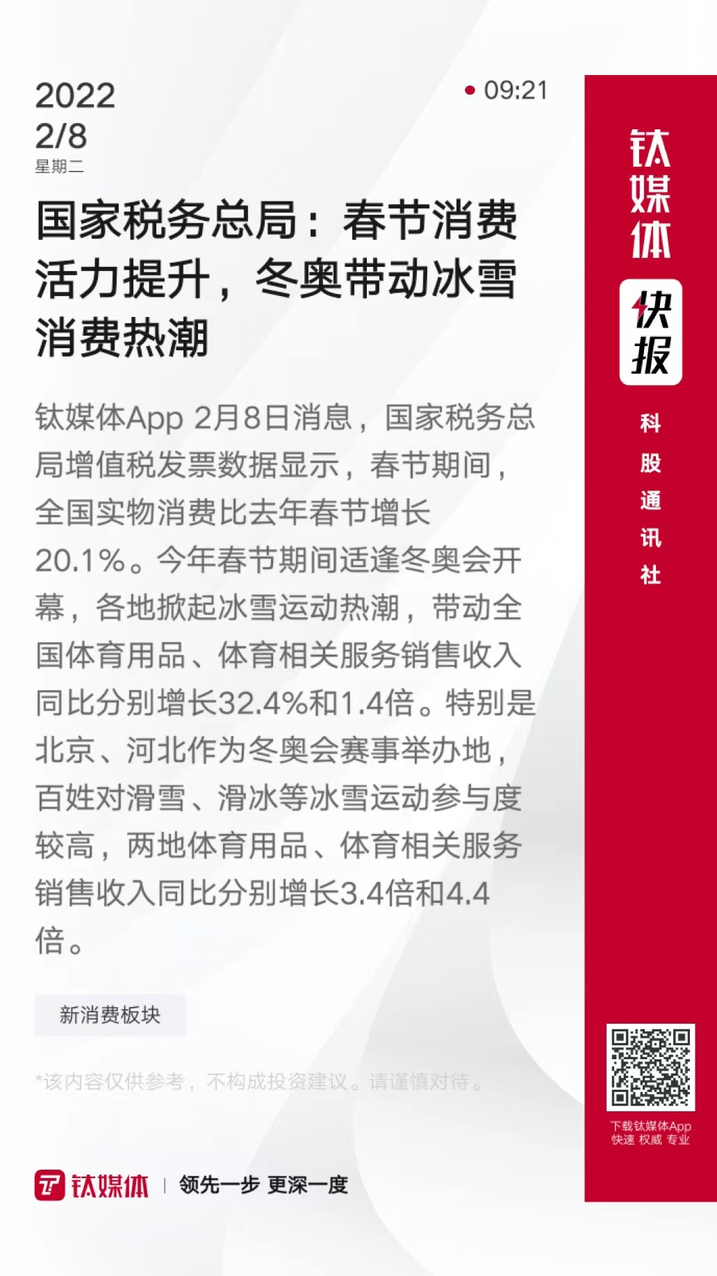 国家税务总局:春节消费活力提升,冬奥带动冰雪消费热潮