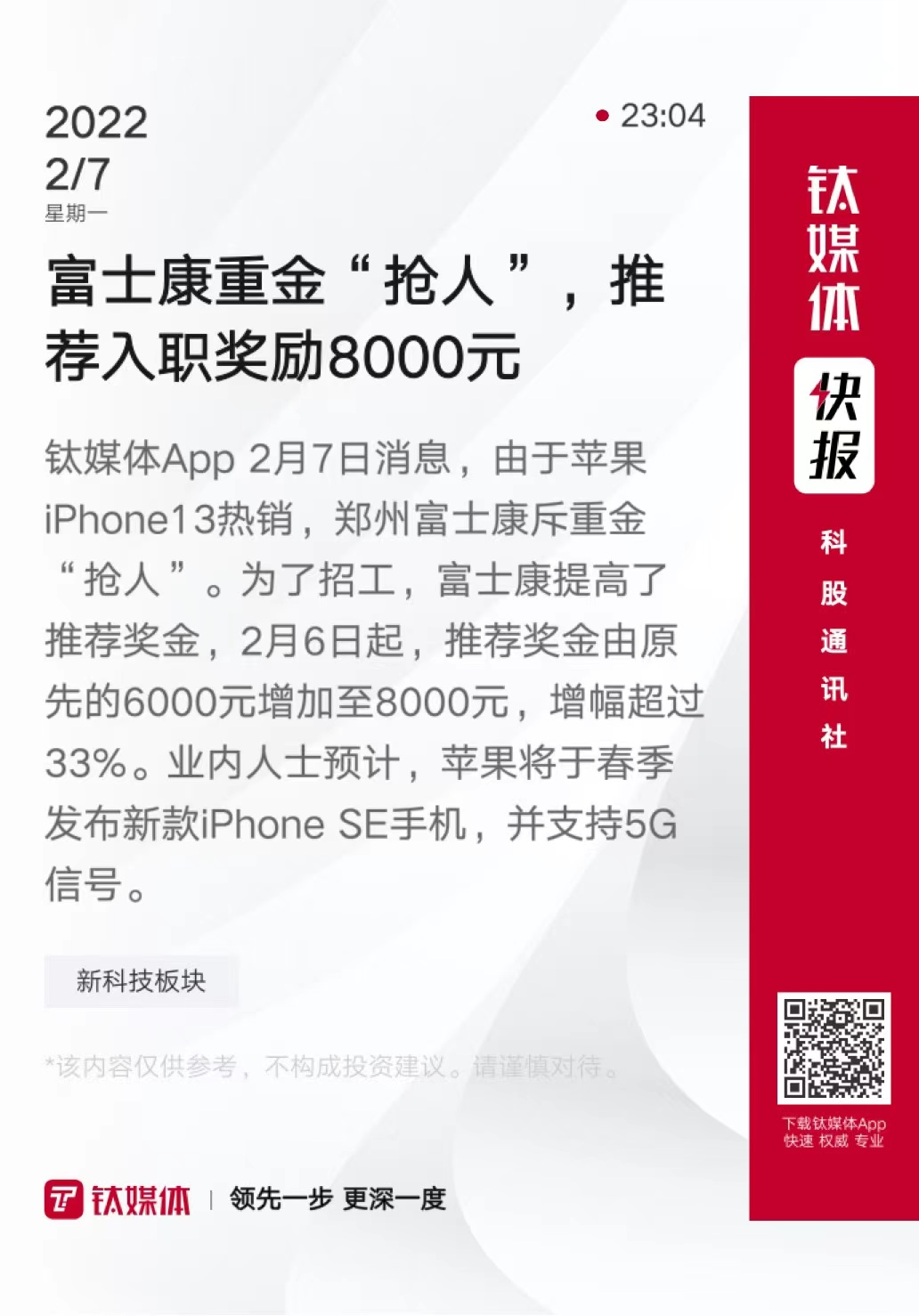 富士康重金“抢人”,推荐入职奖励8000元