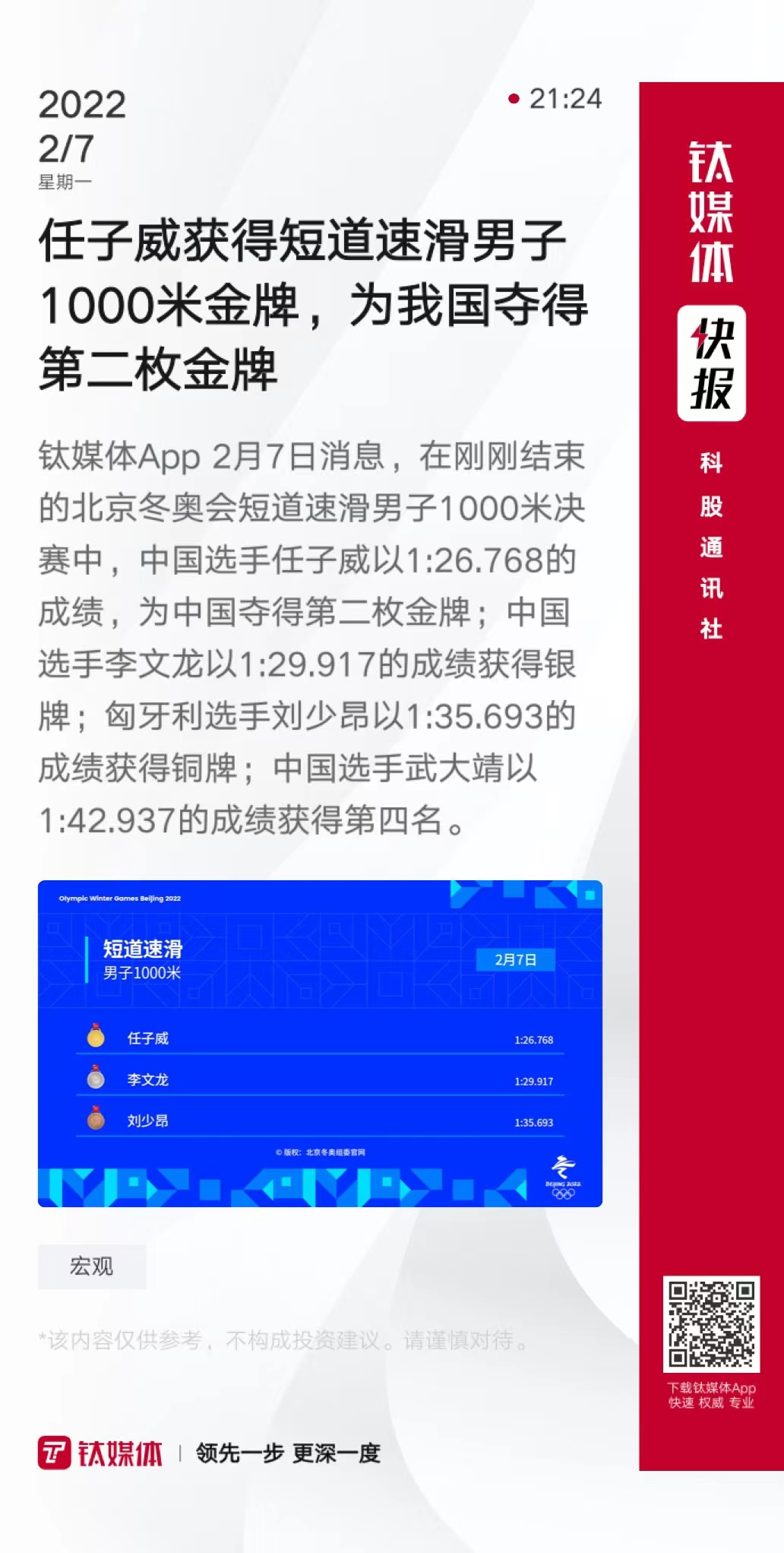 任子威获得短道速滑男子1000米金牌,为我国夺得第二枚金牌