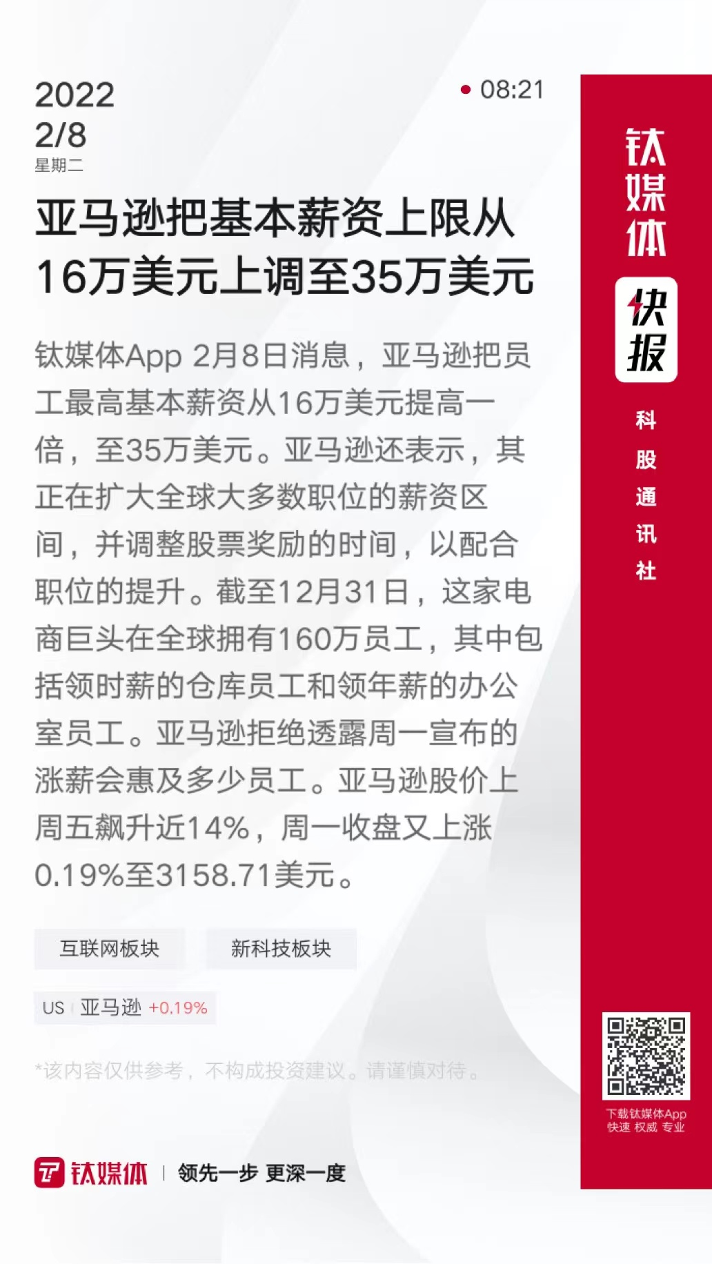 亚马逊把基本薪资上限从16万美元上调至35万美元