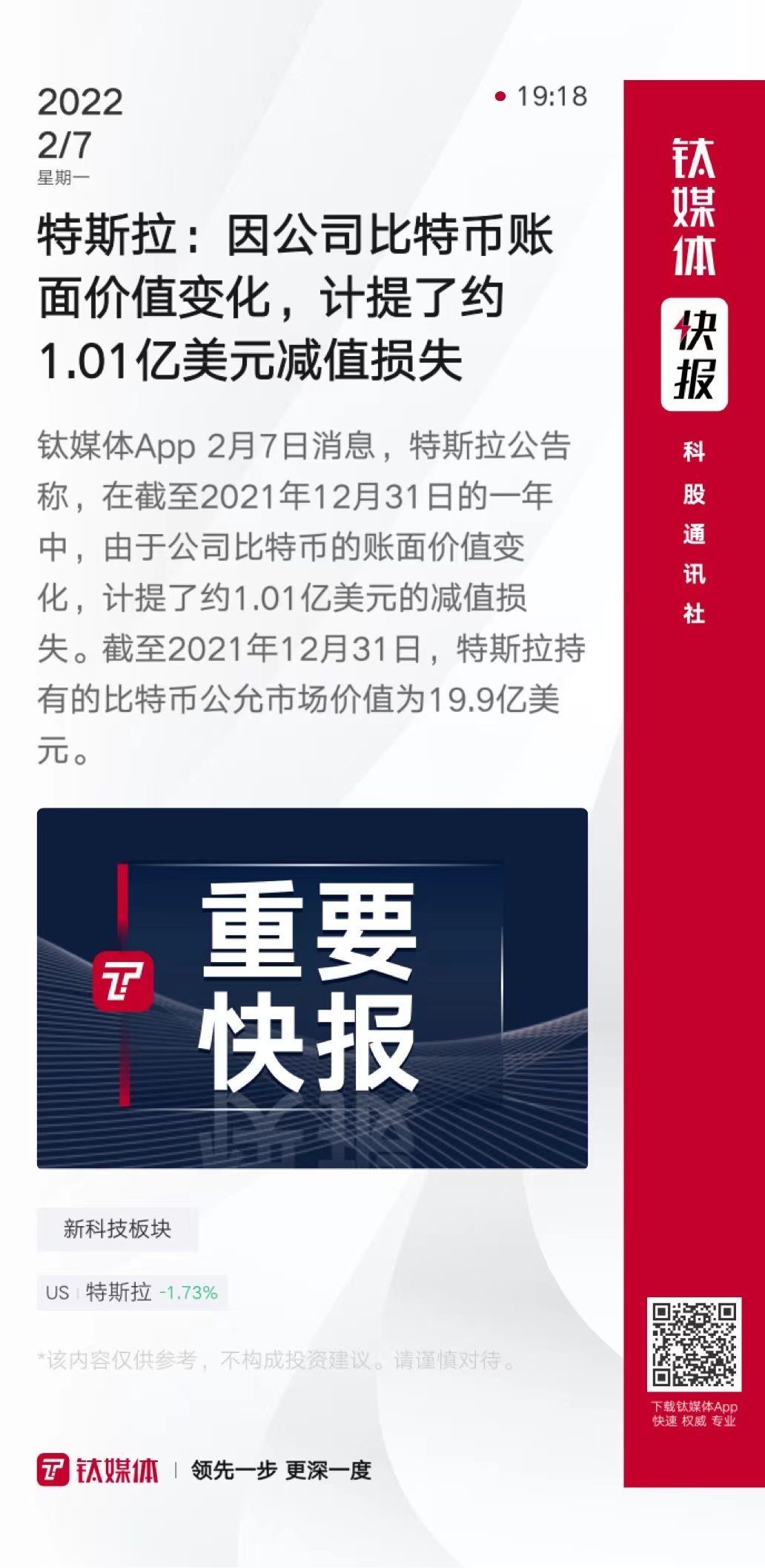 特斯拉:因公司比特币账面价值变化,计提了约1.01亿美元减值损失