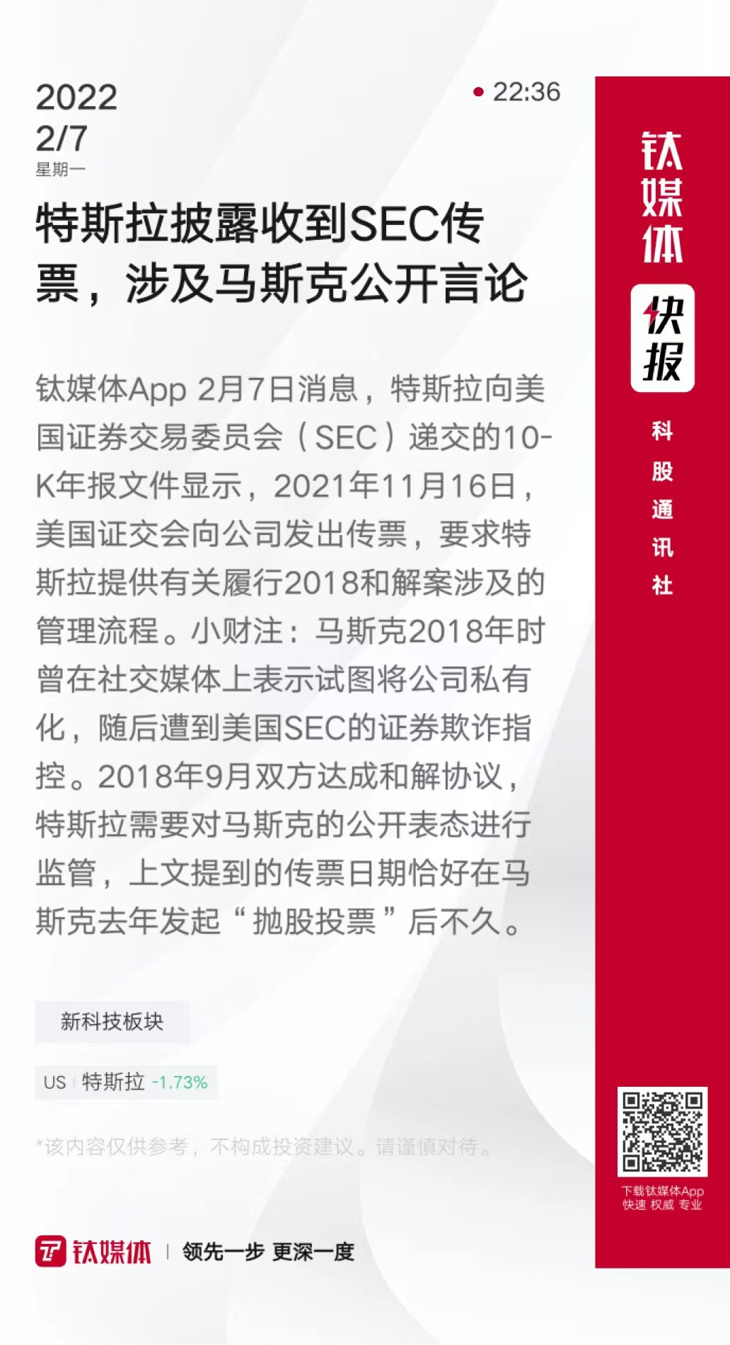 特斯拉披露收到SEC传票,涉及马斯克公开言论