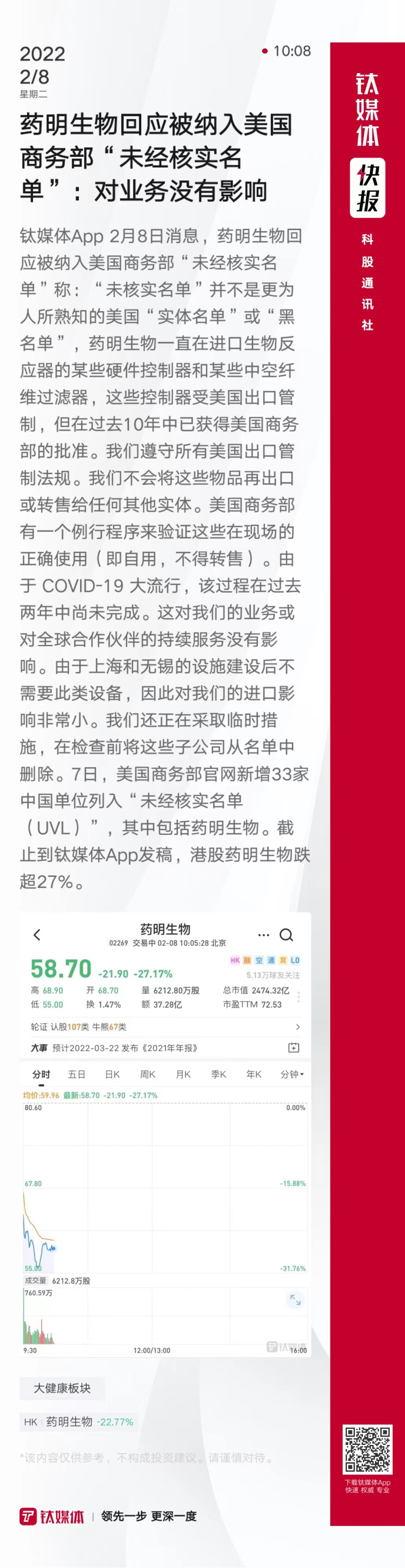 药明生物回应被纳入美国商务部“未经核实名单”:对业务没有影响