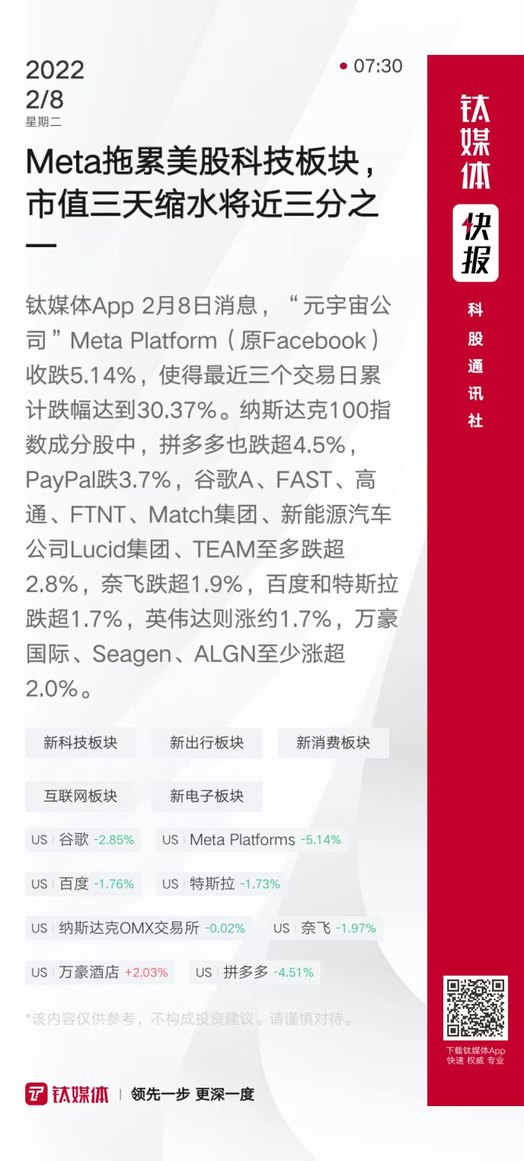 Meta拖累美股科技板块,市值三天缩水将近三分之一