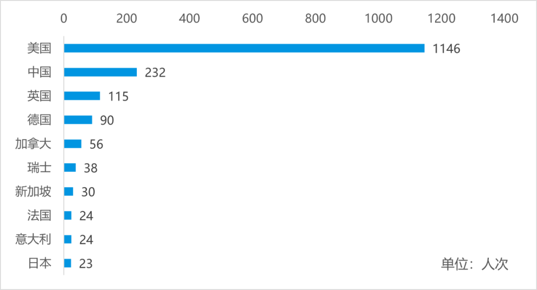 美国入选1146人次,占全球57.3%,是排名第二的中国的5倍