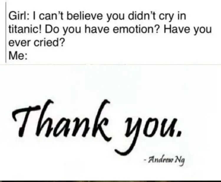 趣味哏图:「女友:你看泰坦尼克都不哭!难以置信!你究竟有没有感情!你哭过没有!AI学子:有啊,吴恩达公开课结尾出手写感谢字幕的时候。」