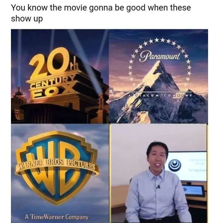 趣味哏图:「当你看到以下片头标时,就会知道影视产品很棒:20世纪佛克斯、派拉蒙、华纳兄弟、吴恩达微笑」