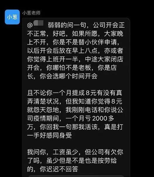 去年年末,部分长沙员工因疫情减工时、降薪导致工资提成大缩水曾在千人大群提出质疑,创始人吕良下场回应时表示疫情期间的茶颜悦色月亏 2000 万,还认为员工没有「感同身受」。「我问你,工资虽少,但公司有欠你了吗,虽少但是不是按劳给的。」