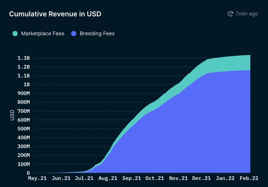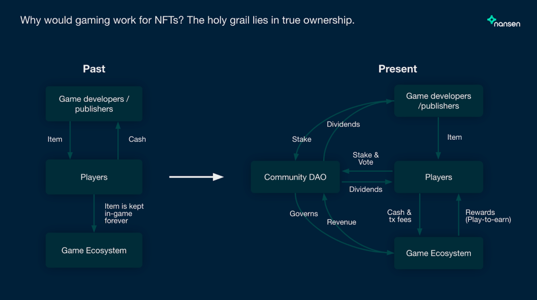 虽然艺术 NFT 是已经获得了主流关注的用例,但有一个 NFT 系列在销量方面超过了所有的艺术 NFT 收藏品:Axie Infinity,这是一款 NFT 游戏,目前在交易量方面夺得桂冠 (不包括 LooksRare 上的清洗交易)。这种 NFT 技术与游戏的整合创造了一种全新的游戏模式:边玩边赚/GameFi。上图:2022年2月3日交易量靠前的 NFT 系列,数据来源:DappRadarAxie Infinity 是2021年的一颗新星,并开启了 P2E (边玩边赚) 游戏的崛起。该游戏在 2021 年创造了超过 13 亿美元的收益,并拥有超过 250 万的日活跃玩家。与传统游戏不同的是,传统游戏的发行商通过向玩家出售资产来获取收益,而 Axie Infinity 则通过从市场交易和 Axie 数字宠物的繁殖费中抽取佣金来获取收益的。玩家通过繁殖这些 Axie 宠物来创造出新的 Axie。该游戏团队的动机是创造出最好的游戏以扩大用户基础,而不是向用户出售资产。上图:Axie Infinity 的累计收益增长情况 (蓝色部分表示其 NFT 市场产生的费用,绿色部分表示 Axie 宠物繁殖时产生的费用)。数据截至2022年2月3日。来源: DappRadar在游戏中整合 NFT 可以为玩家提供与艺术 NFT 类似的优势,让玩家能够真正拥有对自己的游戏内资产的所有权。游戏内的道具甚至角色本身都可以是 NFT。在 Axie Infinity 中,为了玩游戏,你需要拥有被称为 Axie 的 NFT 数字宠物,而游戏内部货币是加密货币 (SLP 代币)。在传统游戏中,流入游戏中的钱通常会滞留在游戏中,因为玩家无法从游戏中获取价值。而 NFT 游戏给予玩家对资产的控制权和所有权,他们可以决定对出售和变现这些资产。上图:传统游戏 (左) vs 区块链游戏 (右) 中的价值流动。图源:Nansen