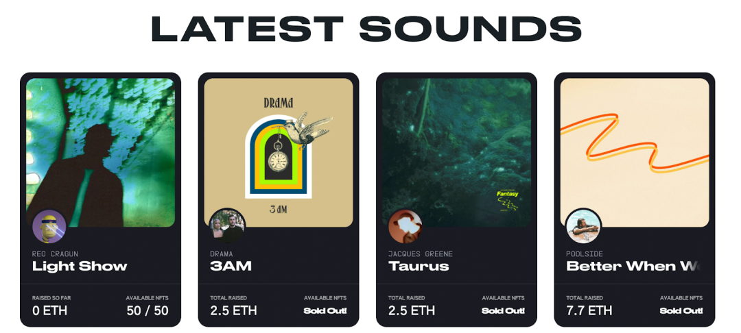 这一趋势也赋予了那些真正粉丝以力量,使他们能够支持和拥有他们最喜欢的音乐艺术家创作的作品的副本,而且是直接从艺术家那里获得。这也为艺术家们创造了新的方式,让他们能够以现有方法难以达到的水平吸引粉丝。通过拥有艺术家作品的原创副本,粉丝们能够对艺术家的未来成功进行押注。艺术家能够得到更公平的回报,而作为一个粉丝,你也可以在艺术家的早期帮助他们。Soun.xyz 和 Catalog 这两个项目正是为音乐艺术家们提供了一个直接将自己的作品以 NFT 的方式出售给粉丝的平台。