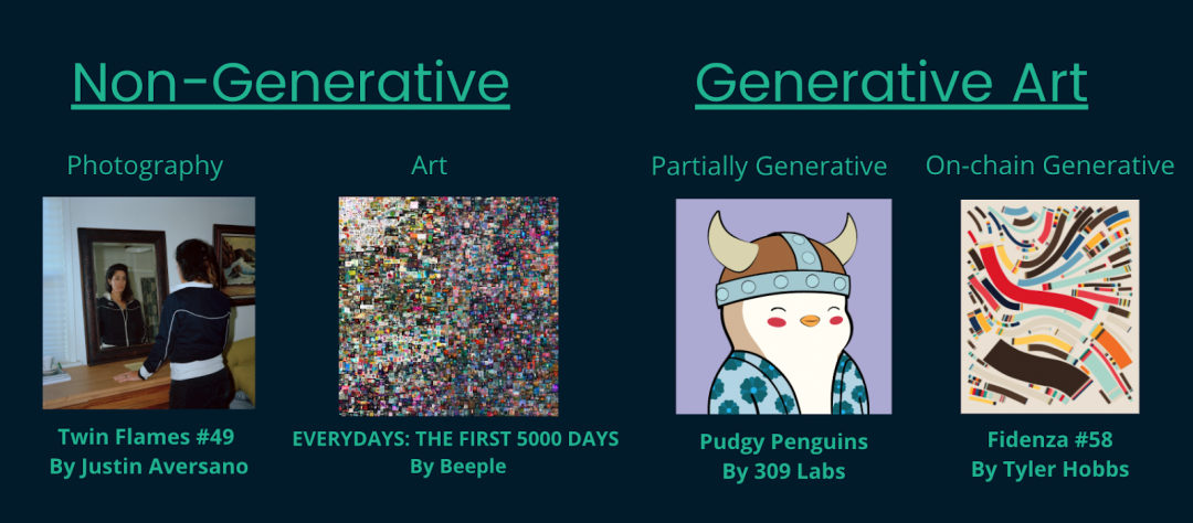 NFT 最流行的用例是作为可收藏的艺术品 NFT。NFT 为艺术家们提供了一种轻松地将自己的艺术品出售给全球受众,同时确保了所有权。艺术 NFT 大体上可以分为两类:非生成艺术 & 生成艺术。当我们想到艺术时,我们通常会想到非生成艺术。它们是人类在没有自主计算机系统的帮助下创作出来的。数字艺术家能够在 NFT 市场 (比如 OpeaSea) 上架他们的艺术品,这样世界上任何地方的任何人都可以查看和购买他们的作品。在今天的传统市场上,艺术家们只能从他们的作品的初始销售中赚钱;而 NFT 让艺术家可以选择将版税写入他们 NFT 艺术作品的智能合约中,这使得他们能够从他们的艺术品价值中获得更加公平的份额。NFT 使得艺术品的真伪和所有权的验证变得容易,这是这项技术带来的巨大好处。这一领域的知名艺术家包括:Beeple、pplpleasr、ferocious 和 Pak。照片 NFT 也是一个正在兴起的 NFT 用例。一些摄影师们正在将他们的锁屏以 NFT 的形式进行出售,并获得与出售 NFT 艺术品的艺术家类似的收益。Justin avisano 是这个领域最著名的人物之一。当他的“Twin Flames” NFT 系列中的一个 NFT 在克里斯蒂拍卖会上被拍卖时,他创造了历史。这类 NFT 的主要市场包括了 Opensea、SuperRare、Foundation、Rarible 和 Nifty Gateway。除了由艺术家单独绘制和创造的艺术,艺术品 NFTs 的兴起在很大程度上归功于生成艺术。生成艺术是通过使用一个自主的计算机系统 (通常是一个算法计算机程序) 来创造的艺术。像 CryptoPunks 和 Bored Ape Yacht Club (BAYC) 这样的个人资料图片 (PFP) 系列就是在这些程序的帮助下创建的。创作者们把每个单独的特征都塑造出了,然后程序就会将这些特征随机组合起来,通过组合这些特征创造出独特的角色。一些生产艺术 NFT 系列是完全由计算机程序完成的,除了需要创建算法之外,无需任何人力投入。这种类型的 NFT 系列中最受欢迎的就是生成艺术平台 Art Blocks 的一些系列,例如 Snowfro 创作的“Chromie Squiggle”和 Tyler Hobbs 创作的“Fidenza”。OpenSea 是生成艺术 NFT 的领先市场,LooksRare 也是一个受欢迎的新推出的 NFT 市场。上图:左边是“非生成艺术 NFT”,右边是“生成艺术 NFT”,分别由 Justin Aversano、Beeple、309 Labs 和 Tyler Hobbs 创作。
