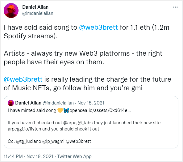 音乐 NFT 是 NFT 的一个新兴用例。就像艺术 NFT 一样,音乐 NFT 是艺术家从他们创作的作品中获得更大份额价值的关键。音乐艺术家们通常只能从他们为音乐行业创造的收入中获得约 12% 的收入。最近,音乐艺术家兼制作人 Daniel Allan 将自己制作的一首音乐铸造成了一个 NFT,并在 OpenSea 上面以 1.1 ETH 的价格出售了该音乐 NFT,这个价格相当于在 Spotify 上 120 万次流媒体播放量。![]()