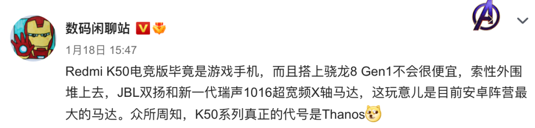 官方将其称为“为K系列用户,打造一部硬核的 Dream Phone 。冷血旗舰:电竞标准,打造更高性能、更强散热;全线拉满:毫无保留的配置升级、不负期待”。按照爆料中提到的说法,这次发布活动中应该会带来全新Redmi K50 电竞版。一同公布的宣传海报中还显示了这款新机的机身设计。结合来看,这款新机配备了一个矩形的后摄模块,模块中设置了两条装饰纹路,机身整体配色呈蓝色,且带有一定的电竞元素。作为一款电竞版机型,Redmi官方给出的定位是,“电竞不是品类,它既是标准,更是态度!K50电竞版,以极致竞技精神打磨的硬核产品”。官方介绍显示,Redmi K50电竞版代表 K系列的“性能巅峰”旗舰、多项新技术首发、多项体验突破。是一部性能强、散热狂、续航长的骁龙8 冷血旗舰。具体规格方面,Redmi K50电竞版将支持双 VC双重液冷散热,提供120W神仙秒充Pro,内置4700mAh电池的情况下,17分钟充满。同时,Redmi红米手机曾表示,K50宇宙将全球首发“CyberEngine超宽频马达”。官方介绍称,这可能是安卓最大尺寸,最大振量,最宽频率;为未来游戏手柄、元宇宙设备定制;560mm 体积,50Hz-500Hz 超宽频率;稳态振动量是常用 0809 马达的 3 倍。以往的爆料也曾提到,即将到来的Redmi K50电竞版将搭载骁龙8芯片,由于其最终定价不会很便宜,所以外围堆料会增加。其将带来JBL双扬和新一代瑞声1016超宽频X轴马达。而最近出现的一份消息中则提到,搭载最新的骁龙 8处理器的Redmi K50 电竞版可能会定价3499元。这也与以往爆料中提到的消息接近。不过,鉴于暂时还没有确切的官方信息出现,相应的爆料大家用作参考即可。事实上,除了电竞版,全新的Redmi K50系列还存在着多个其他版本。按照爆料中的说法,全新的Redmi K50系列将推出标准版本、Pro版本、“超大杯”版本,以及即将发布的电竞版。其中,标准版本Redmi K50将搭载骁龙 870处理器,支持67W 快充;Redmi K50 Pro将搭载天玑 8000处理器,支持66W 快充;Redmi K50 Pro+核心搭载天玑9000处理器,支持120W快充。相关爆料还显示,这三款机型实际的产品定价可能会在1999元至3299元之间。据悉,在即将发布的Redmi K50 电竞版之外,Redmi K50系列的其他三款新机也通过了核准。也就是说,这三款机型距离正式到来也正在越来越近,至于实际的到来时间还有待后续确认。不过,随着Redmi K50 电竞版发布活动的接近,接下来应该还会有更多的消息出现。![]()