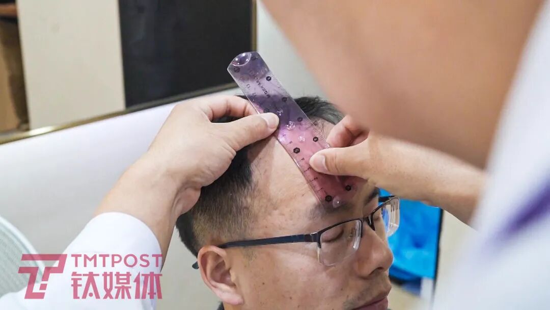 据卫健委2020年数据,中国2.5亿的脱发人群中,65.6%为男性。“到我们这里植发的男女比例大概是1:1,来植发的人不一定是脱发,很多人就是想要一个更美观的效果。”北京碧莲盛植发中心一名医生介绍,“女生更有可能选择‘艺术植发’,这样的植发主要针对发际线、眉毛、胡须等,更接近医美范畴。”26岁的王越就是其中一个,她在北京经营一家会展服务工作室。王越爱美、爱拍照,常常把照片发到社交网络上。有一次,一个闺蜜开玩笑地说王越脑门大,说者无意听者有心,“脑门大”开始成为王越的心病。从那以后,无论是和朋友合影还是自拍,她修图都会先修额头。去年过年后,她养成了每次出门都戴帽子的习惯。王越没有脱发的烦恼,但她对自己的脑门不满意。面诊医生给的方案是对发际线稍加调整,达到“三庭五眼”的黄金比例。“三庭五眼”是指将整个面部按照“发际线到眉间连线”、“眉间到鼻尖”、“鼻尖到下巴尖”的范围分为上庭、中庭、下庭,三个区域比例是1:1:1。测量之后,王越的下庭和中庭都是6.5厘米,上庭也就是额头部分是8厘米。医生认为上庭高度不能低于6厘米,否则会破坏比例。但按照6厘米画线之后,王越仍然觉得不满意,要求再调低,并最终调整到了5.8厘米。王越想要“头包脸”的效果,这是当下比较流行的“审美标准”:颧骨宽度小于颅骨宽度,形成“头大脸小”的视觉效果,很多当红女星都是“头包脸”。“头包脸”是由先天骨骼决定的,后天很难改变,但能通过修改发际线达到视觉上接近的效果。为了达到这样的效果,医生要从王越后脑勺提取3050个毛囊移植到额头,手术时间长达9个小时。对王越来说,容貌焦虑似乎没有尽头。除了对脑门不满意,她还觉得自己下巴有点方,打算“植完发再去打点玻尿酸”。35岁危机:同事来自清北、哈佛、斯坦福