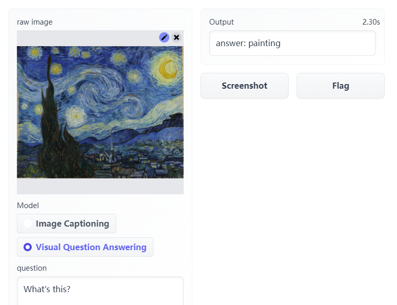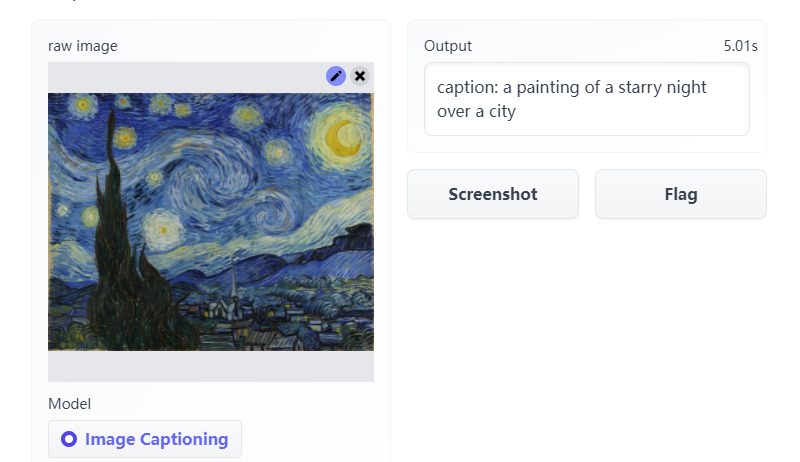 作者给的一个例子是梵高的星空图,BLIP起的标题是「caption: a painting of a starry night over a city(一幅描绘城市星空的画)」。