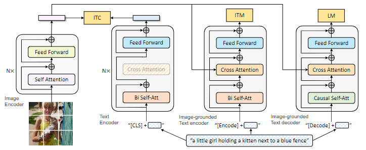 该模型与三个视觉语言目标共同进行预训练,即图像-文本对比学习(image-text contrastive learning)、图像-文本匹配(image-text matching)和图像-条件语言建模(image-conditioned language modeling)。