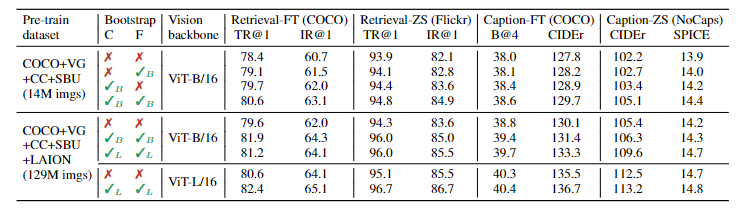 可以看到,CapFilt可以通过更大的数据集和更大vision backbone来进一步提高性能,也证实了它在数据规模和模型大小方面的可扩展性。