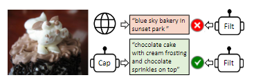 其中包含了两个模块:一个是给定网络图像生成字幕的Captioner,另一个是去除噪声图像-文本对的Filter。