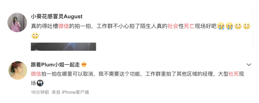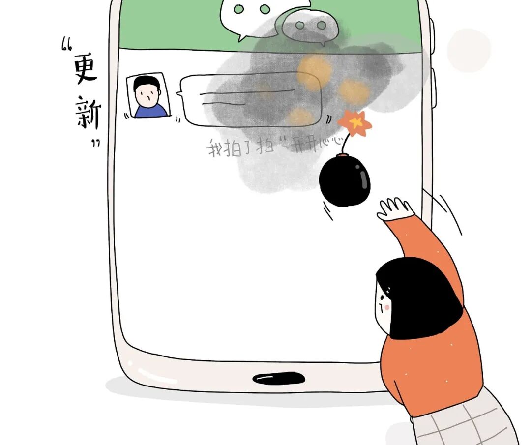 当这几个字出现在微信工作群的时候,陈米差点窒息在办公室。这是一个一百多人的工作群,而当看到拍他的是他直属领导时,陈米直接社死了,“那种感觉就像是躺在棺材里。”“他尴尬,我尴尬,拍一拍这个功能一尬就是两个人的尴尬,领导还不会撤回。”于是,在拍一拍沉寂一分后,领导又发了一条让他去办公室的消息,以便缓解尴尬。这条拍一拍后缀是陈米和朋友们开玩笑一起改的,这事发生后,陈米默默取消了后缀。在社交平台,微信和社死一起搜索,随处可见的就是网友分享的“社死现场”。而如果要票选出微信上最社死的一个功能,那么可能就是“拍一拍”。张小龙说,拍一拍是微信史上仅需一行代码的有趣功能,让用户“像蚂蚁一样打招呼”。然而在年轻人的世界,拍一拍变成潘多拉魔盒,有时候原本想像蚂蚁一样打招呼,却在不断的“误拍”中体会社死。对职场人来说,微信上的社死危机四伏,“拍一拍滑铁卢”只是其中之一。近日,微信更新功能上线了群聊折叠功能,可以选择将一些群聊在聊天列表中折叠,对话被固定后,就不会被新消息顶起来,这无疑是件好事——大大减少了“想分享沙雕图片给置顶的好友群,结果电光火石之间工作群有新消息并且抢占顶部,于是我把沙雕图发进了工作群”的尴尬。然而,从网友的反应中可以看到,社畜们远没有得到救赎,社死还是轻易地在微信上发生着。能不能有个发送信息确认步骤?能不能延长撤回的时间?能不能让PC端更换聊天背景?职场人被发错消息的恐惧支配着,发消息1秒钟,确认对象1分钟。在豆瓣47万人的“社会性死亡”小组,微信成为社会性死亡的高发区。对于职场人来说,微信社死更是常见:手滑不小心拍到同事、屏蔽同事朋友圈被发现、把同事设置聊天免打扰、把摸鱼消息发到工作群、群发消息变成群聊、视频号能看到好友点赞过的视频、想修改在群里的昵称结果直接改了群名、想给群加个备注结果直接改了群名......这样的社死现场不断地提醒打工人:珍爱工作,慎用微信。字母榜和五位职场人士聊了聊他们的“职场微信社死现场”,以下是他们的故事:我在公司一直都是比较乖巧且腼腆的形象,平时也不怎么和大家交流私生活,朋友圈转发内容都是一些新闻和行业相关内容。其实是因为,我发的一些比较逗比欢快和明星有关的内容,都屏蔽了公司同事。然而,我没有想到有一天,我包装的内向人设,都因为微信的拍一拍而破功。有一天晚上,我在家里加班。然后一个二十多个人的群里,屏幕上突然出现了:而上一条消息正是主管发来的一个链接,再上面也都是收到、收到、好的等之类的工作回复。原来,主管甩了一个链接给我,让我把这个链接里的内容修改一下。他原本是想要艾特我的,结果不小心拍了拍我。当时我整个人都不好了,我想装死,那样大家就不会知道群里这个“易洋千玺的老婆”是我了。就在大家沉默不发言,我在电脑前手拍桌、头砸桌的时候,这位80年生人的主管又在群里接了一句:“小许,你结婚了?”社死真的就在一瞬间。当我看到这条消息的时候,我都愣住了,这是我和小姐妹一起商量改的后缀。群里不仅有80后,还有几个90后姑娘,还好有一个跟我差不多大的同事在群里发了一个表情包,缓解了尴尬的气氛。我只能解释一下,“不是,这是我偶像”。当然,最让我社死的是,这个后缀,让我长期以来树立的乖巧形象坍塌了。我以为这就结束了,结果,第二天到公司,主管直接喊我,“易洋千玺的老婆,来我办公室一趟”。我当时正在喝水,听到老板这样说的时候,我的脸整个涨的红彤彤的,差点被呛住。我还注意到好多道眼光看向我,伴随着一些低笑声,我尴尬的恨不能原地爆炸。但也是因为这件事儿,在办公室,我开始和大家慢慢的交流起来。