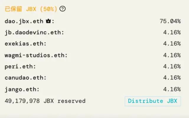 保留 49179978 枚 JBX 将按照上图方式分配给项目团队成员和项目所有者。