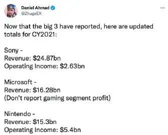 2月4日,Niko Partners分析师Daniel Ahmad在推特发文,汇总并公布了任天堂、索尼和微软三家2021年的财报数据。