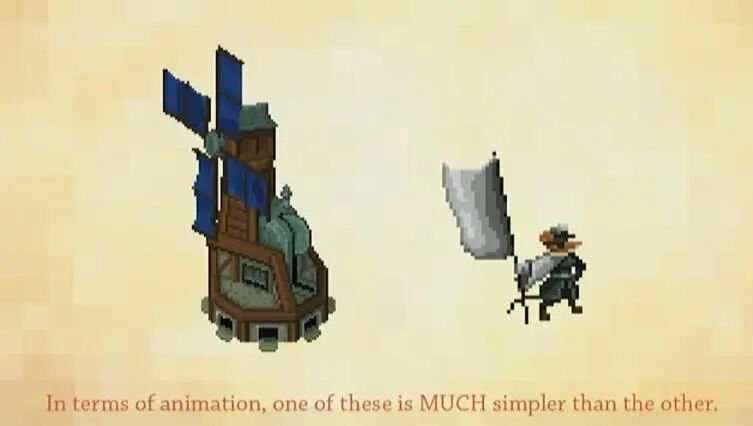所有的建筑都做了动画,中间这个风车是我最喜欢的东西。我向Pocketwatch表示,所有的美术工作一开始都做成静态,这样我们就不用在调整的时候重做大量的工作,因为我们的时间非常有限。