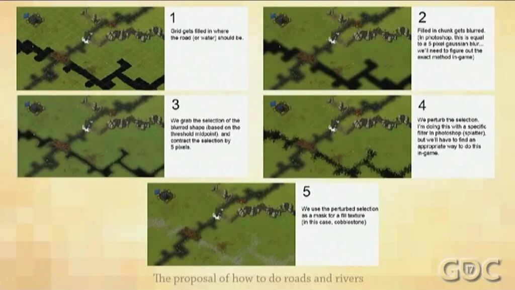 这张图展示了我们对游戏里的道路和河流设计的迭代过程,感兴趣的读者可以仔细阅读。因为我们的时间有限,所以承受不起沟通问题带来的时间浪费,我们做了这些东西,确保所有事情都被每一个成员完全解。