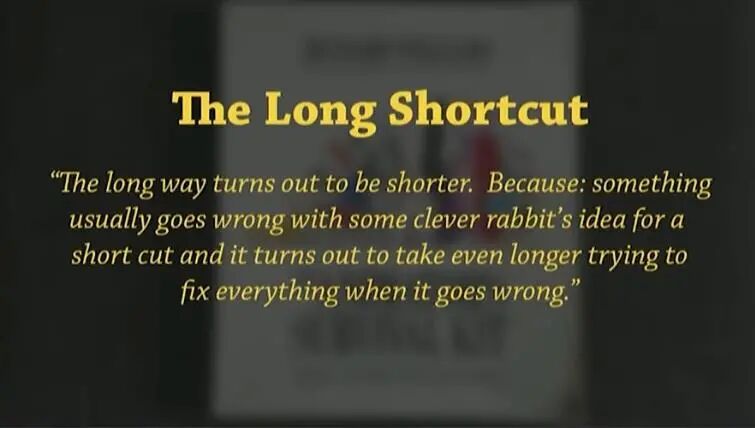 长路结果会变得更短,因为有些非常清楚的捷径想法通常会出现错误,结果会用更长的时间去解决出错之后的所有事情。重要的事情是需要时间的,不要因为你最初试图省时间而浪费更多的时间,你可能会因此重复做很多事情。