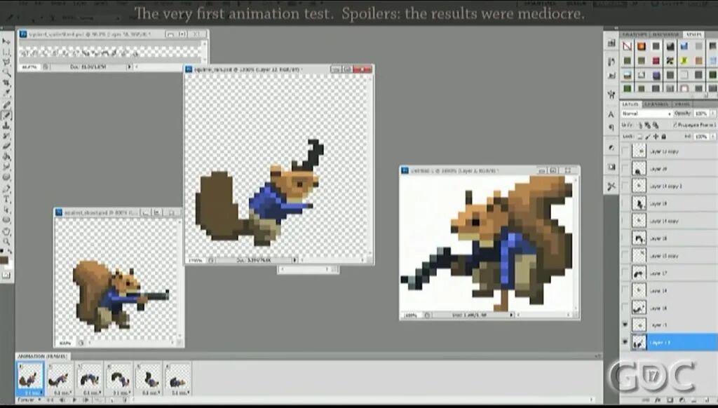 实际上,像素风让这个目标更容易实现,因为我们只需要聚焦于典型的姿势动画,砍掉了大量的细节动作,而不用招聘大量的动画师。但是,用Photoshop做动画对我来说简直是难于登天,当然,我说这话就是一个糟糕的美术师在抱怨他的工具,而且我也不得不降低要求,因为要做的动画实在是太多了。