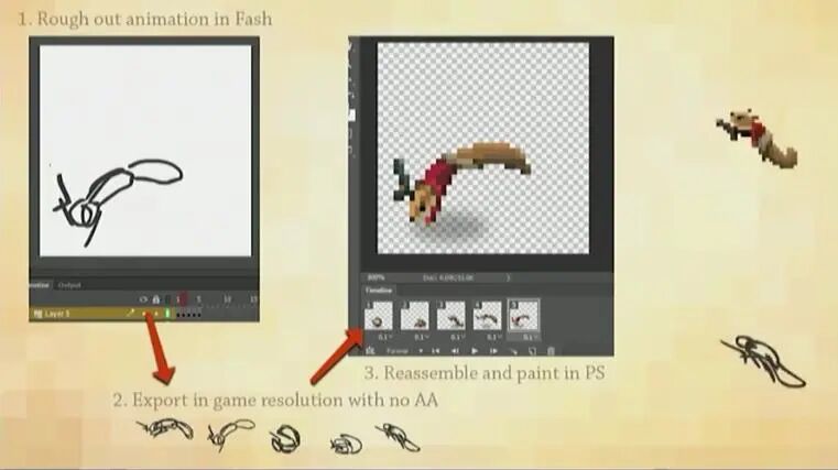 但最早的工作流程告诉我们,动画仍然是个很大的问题,即便我们选择了像素风。这里需要说的是,我对动画的目标是,让它做到流畅自然,而不是一眼看上去就是像素移动,我们不能只是做一个普普通通的独立像素游戏。