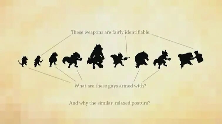 其中一个比较大的问题是角色的轮廓设计并不谨慎,比如大多数角色的姿势、武器大小都很接近。有人可能觉得谈角色轮廓有点小题大做,但对于角色设计师来说,这些都是重要的工具,比如《辛普森一家》当中,角色的形象设计都不是偶然的,如果你想让角色脱颖而出,就要为他们设计独特的轮廓,如果能在轮廓当中加入一些有用的信息更好。