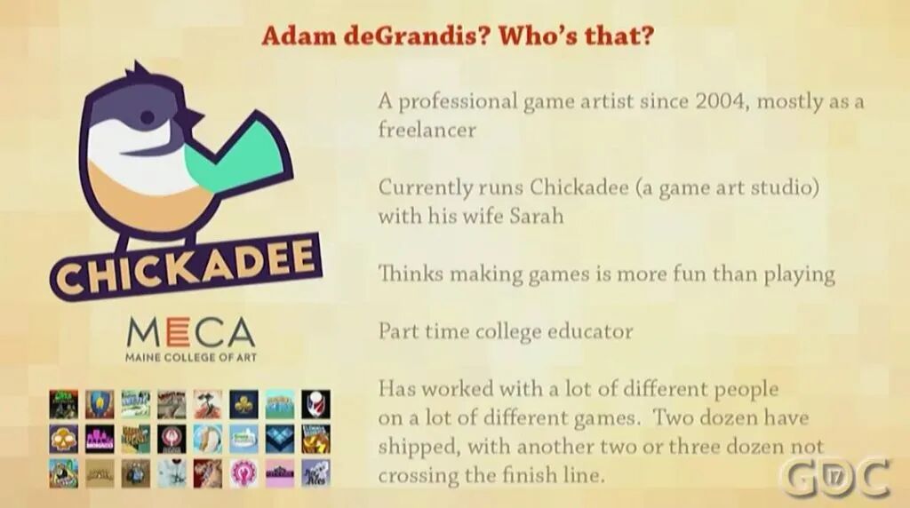 我目前与妻子Sara共同经营一家艺术设计工作室Chickadee,还在缅因艺术学院担任兼职美术老师。我自从2004年开始从事游戏行业,大多数时候作为自由职业者,当我开始的时候,并没有意识到人们已经非常专业化了,比如游戏行业的美术师有概念美术、技术美术、VF美术,我当时没有意识到这些岗位之间有明显的差别,而我又是自学的,所以学习这些东西用了很长时间。