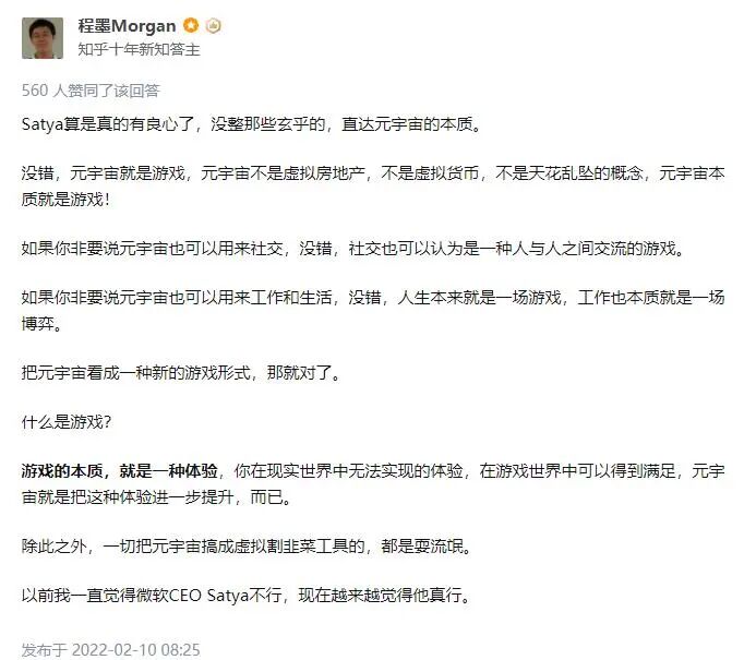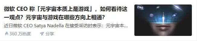 近日,微软CEO萨提亚·纳德拉(Satya Nadella)在接受采访时就认为,“元宇宙本质上就是游戏,它能够将人物、地点、事物放入物理引擎中,然后相互关联”。纳德拉的言论很快在知乎掀起了讨论,一度登上话题热搜榜第9。