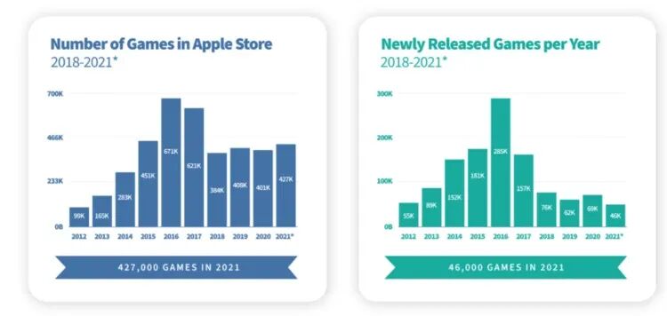 从新产品供应角度看,2021年全年Appstore上架新游戏只有4.6万款、过去10年最低,手游市场的竞争烈度实质在下降,而对新游戏来说,2021年从发布到产生规模化收入,平均只需要花费6个月时间就可进入欧美畅销榜TOP100以内,相比2020年减少了2个月。