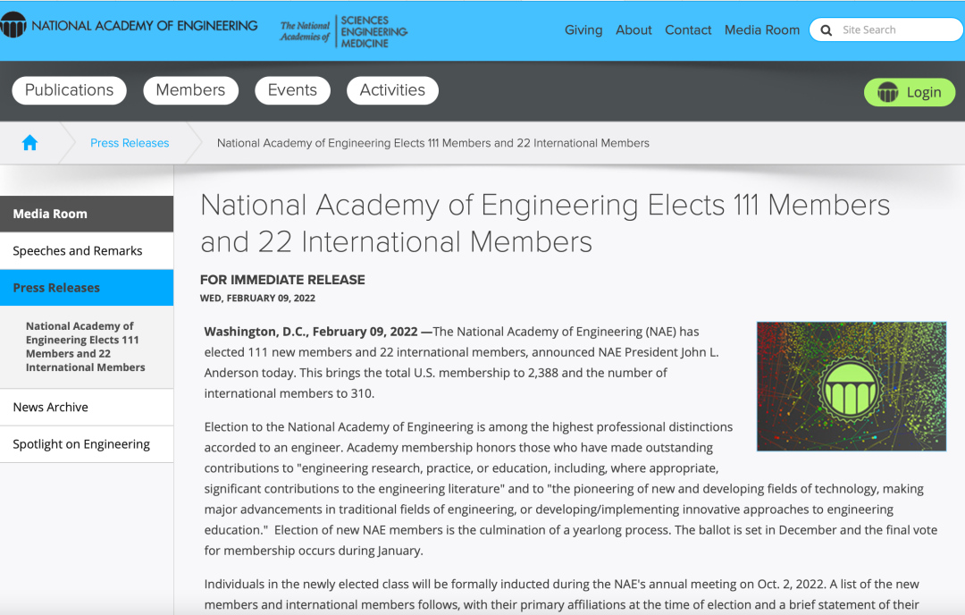 名单链接:https://www.nae.edu/?id=270224作为美国工程学界的最高学术团体,美国国家工程院不以盈利为目的,不仅是美国工程技术界最高水平的学术机构,也是世界上较有影响的工程院之一。工程学界的三大奖项(拉斯奖、哥登奖、查尔斯·斯塔克·德雷珀奖)均由美国国家工程院评选。而入选美国国家工程院院士,是工程界最高专业荣誉之一,以表彰那些在“工程研究、实践或教育方面做出突出贡献的人,包括在适当情况下对工程文献做出重大贡献的人”,以及在“开拓新的和发展中的技术领域,在传统的工程领域取得重大进展,或制定/实施创新的工程教育方法的人”。![]()