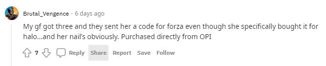 想要《地平线5》兑换码的玩家也没好到哪里去,他们从亚马逊购买指甲油,却被告知亚马逊的收据无法通过审核。