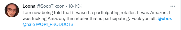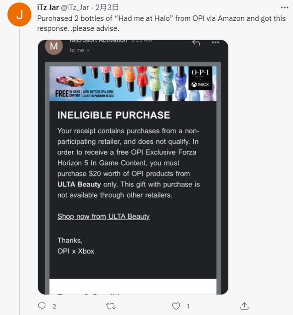 当前的公告几乎涵盖了玩家们此前遇到的一切问题。公告强调,两款联动兑换码的活动“仅限美国地区”,且必须在“一次交易”内满足20美元的条件。《地平线5》的跑车皮肤要在化妆品零售商犹他美容(Ulta)的线下门店或线上网站购买指甲油才能获得,而《光环:无限》联动是亚马逊独家活动,只有2月1日以后在亚马逊上购买才算数。