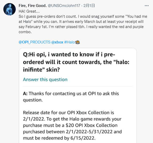 然而自联动商品推出起,许多玩家在社交媒体上表示,没有收到他们应得的奖励。他们通过官网或各种零售渠道购买了OPI的指甲油,却碰到了各种各样的问题。