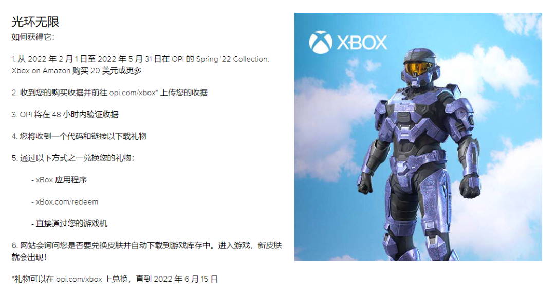 不论玩家的动机如何,按照活动说明,玩家在指定店家购买价值超过20美元的指甲油(至少购买两瓶指甲油),然后前往OPI网站上传收据或购买记录截图,待到48小时内审核通过后,就能获得两款微软游戏的皮肤兑换码。
