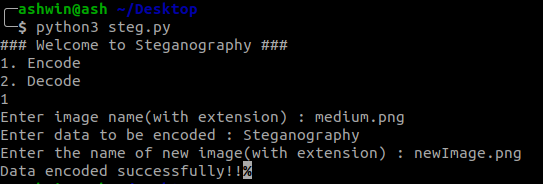 # Python program implementing Image Steganography# PIL module is used to extract# pixels of image and modify itfrom PIL import Image# Convert encoding data into 8-bit binary# form using ASCII value of charactersdef genData(data):# list of binary codes# of given datanewd = []for i in data:newd.append(format(ord(i), '08b'))return newd# Pixels are modified according to the# 8-bit binary data and finally returneddef modPix(pix, data):datalist = genData(data)lendata = len(datalist)imdata = iter(pix)for i in range(lendata):# Extracting 3 pixels at a timepix = [value for value in imdata.__next__()[:3] +imdata.__next__()[:3] +imdata.__next__()[:3]]# Pixel value should be made# odd for 1 and even for 0for j in range(0, 8):if (datalist[i][j] == '0' and pix[j]% 2 != 0):pix[j] -= 1elif (datalist[i][j] == '1' and pix[j] % 2 == 0):if(pix[j] != 0):pix[j] -= 1else:pix[j] += 1# pix[j] -= 1# Eighth pixel of every set tells# whether to stop ot read further.# 0 means keep reading; 1 means thec# message is over.if (i == lendata - 1):if (pix[-1] % 2 == 0):if(pix[-1] != 0):pix[-1] -= 1else:pix[-1] += 1else:if (pix[-1] % 2 != 0):pix[-1] -= 1pix = tuple(pix)yield pix[0:3]yield pix[3:6]yield pix[6:9]def encode_enc(newimg, data):w = newimg.size[0](x, y) = (0, 0)for pixel in modPix(newimg.getdata(), data):# Putting modified pixels in the new imagenewimg.putpixel((x, y), pixel)if (x == w - 1):x = 0y += 1else:x += 1# Encode data into imagedef encode():img = input("Enter image name(with extension) : ")image = Image.open(img, 'r')data = input("Enter data to be encoded : ")if (len(data) == 0):raise ValueError('Data is empty')newimg = image.copy()encode_enc(newimg, data)new_img_name = input("Enter the name of new image(with extension) : ")newimg.save(new_img_name, str(new_img_name.split(".")[1].upper()))# Decode the data in the imagedef decode():img = input("Enter image name(with extension) : ")image = Image.open(img, 'r')data = ''imgdata = iter(image.getdata())while (True):pixels = [value for value in imgdata.__next__()[:3] +imgdata.__next__()[:3] +imgdata.__next__()[:3]]# string of binary databinstr = ''for i in pixels[:8]:if (i % 2 == 0):binstr += '0'else:binstr += '1'data += chr(int(binstr, 2))if (pixels[-1] % 2 != 0):return data# Main Functiondef main():a = int(input(":: Welcome to Steganography ::\n""1. Encode\n2. Decode\n"))if (a == 1):encode()elif (a == 2):print("Decoded Word : " + decode())else:raise Exception("Enter correct input")# Driver Codeif __name__ == '__main__' :# Calling main functionmain()