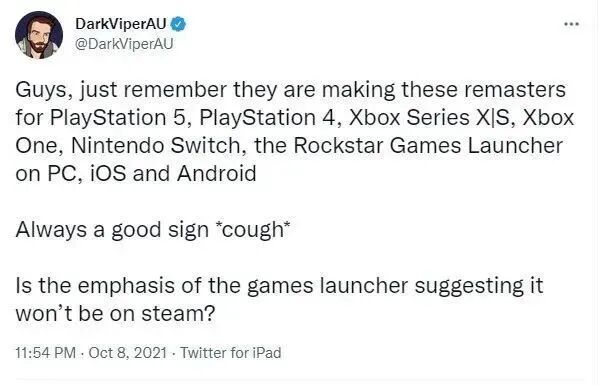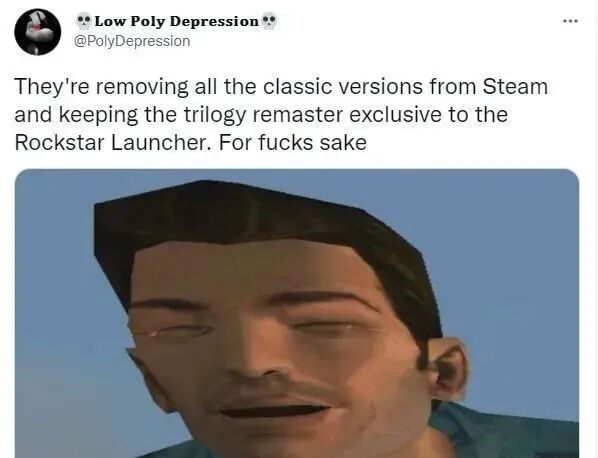 R星近日公布了《GTA:三部曲 最终版》,而原版将在Steam上下架,导致PC平台的原版游戏只能在R星平台上购买,国外怀旧玩家对此表示愤怒,甚至有玩家推测《GTA:三部曲 最终版》可能是R星平台独占。