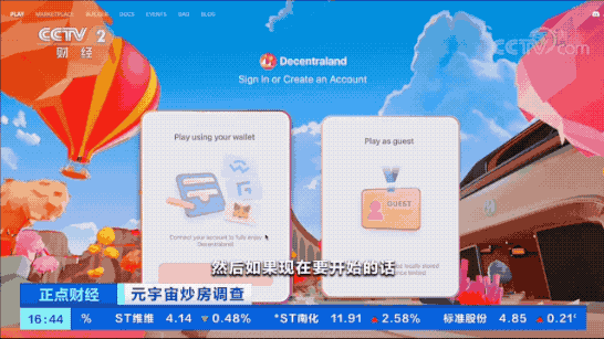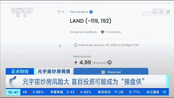 国金证券互联网传媒首席分析师 杨晓峰:目前整个海外市场里,相对而言交易量最高的排名,就是从所有的NFT(非同质化代币)资产里面排名,Decentraland能排到第三名,Sandbox大概能排到第六名。Decentraland能卖到交易量有23万以太币(46亿元),Sandbox大概是13万以太币(26亿元)的规模。