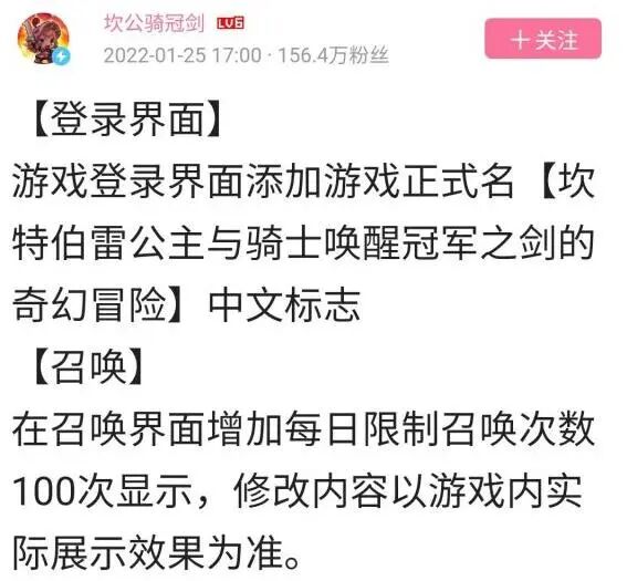2022年1月25日,B站代理的《坎公骑冠剑》首先发布更新公告,表示更新后将“增加每日召唤次数100次显示”。