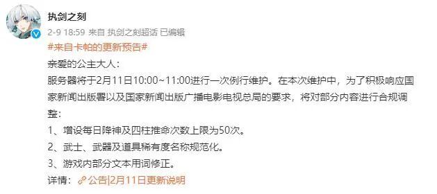 2月11日,三年前年上线的女性向手游《执剑之刻》也发布公告称,为了积极响应版署与广电总局的要求,将在当日更新中增设单日抽卡次数限制,即达每日50次上限后将无法继续参与。