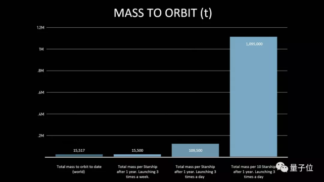 以此类推,如果一个星舰每天发射3次,1年发射总质量可达约11万吨。