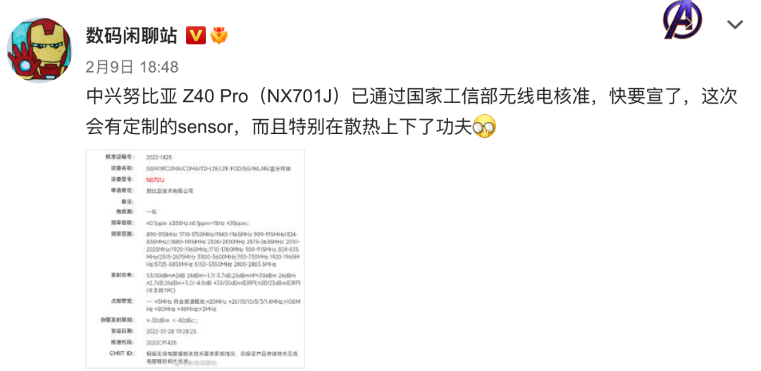 据悉,努比亚手机官方曾在上个月下旬发布消息称,“2022,努比亚Z40 Pro即将到来”。官方将这一代新机称为,“努比亚史上最强Z系列旗舰”,并确认其将于2月正式发布。按照官方公布的信息,这款全新的努比亚旗舰将在核心搭载全新骁龙8芯片,首发航天级散热新材料;行业首家定制光学,35mm人文镜头,打造大师级拍摄体验。同时,努比亚还剧透了即将搭载于这款新机的“行业变革性技术点”,即业界首家定制光学、全像素疾速对焦、首发航天级微纳腔、石墨烯相变均温板。结合目前公布的信息来看,全新努比亚Z40 Pro成像畸变降低35%,镜头进光量提升80%,画面清晰度提升78%,全场景成片率提升70%,散热系数提升30000%。除了官方公布的信息外,博主@熊猫很禿然 也于近日曝光了这款新机的部分参数规格。其中提到,“imx787,1/1.3±左右大底,5000w像素,f1.6大光圈,35mm,努比亚z40pro首发”。结合爆料中的说法,全新努比亚Z40 Pro将首发搭载索尼 IMX787 传感器,拥有1/1.3英寸左右大底,5000万像素支持,f1.6大光圈。综合来看,这份爆料中显示的应该就是此前官方剧透中多次提到的镜头组件具体规格。就此来看,这款新机在实际的影像支持方面令人期待。同时,来自博主@数码闲聊站 的消息显示,一款型号为NX701J的新机于近日通过了无线电核准。这份爆料中将其称为中兴努比亚 Z40 Pro,并表示其接下来应该就会正式官宣,将搭载定制的sensor,而且特别在散热上下了功夫。至于这款新机的实际到来时间,暂时还没有确切的信息。不过,努比亚技术有限公司总裁倪飞在今日的一条消息中,带着“努比亚 Z40 Pro”的机型小尾巴。这似乎也预示着这款新机距离正式到来正在越来越近了,感兴趣的用户可以继续保持关注。![]()