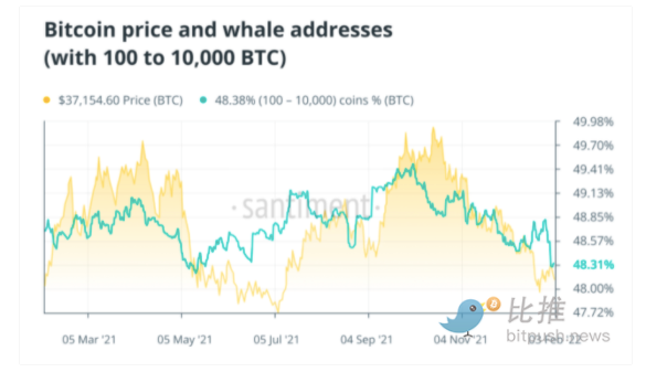 Santiment数据显示,比特币巨鲸—即那些持有 100 到 10,000 BTC 的地址,在过去三个月中已经抛售了大约 150,000 BTC。这一群体持有的供应量经常被用作价格下一步走势的主要指标。这些鲸鱼地址目前持有的供应量已降至47.31%,接近 5 月中旬价格迅速下跌时的一年低点 47.20%。