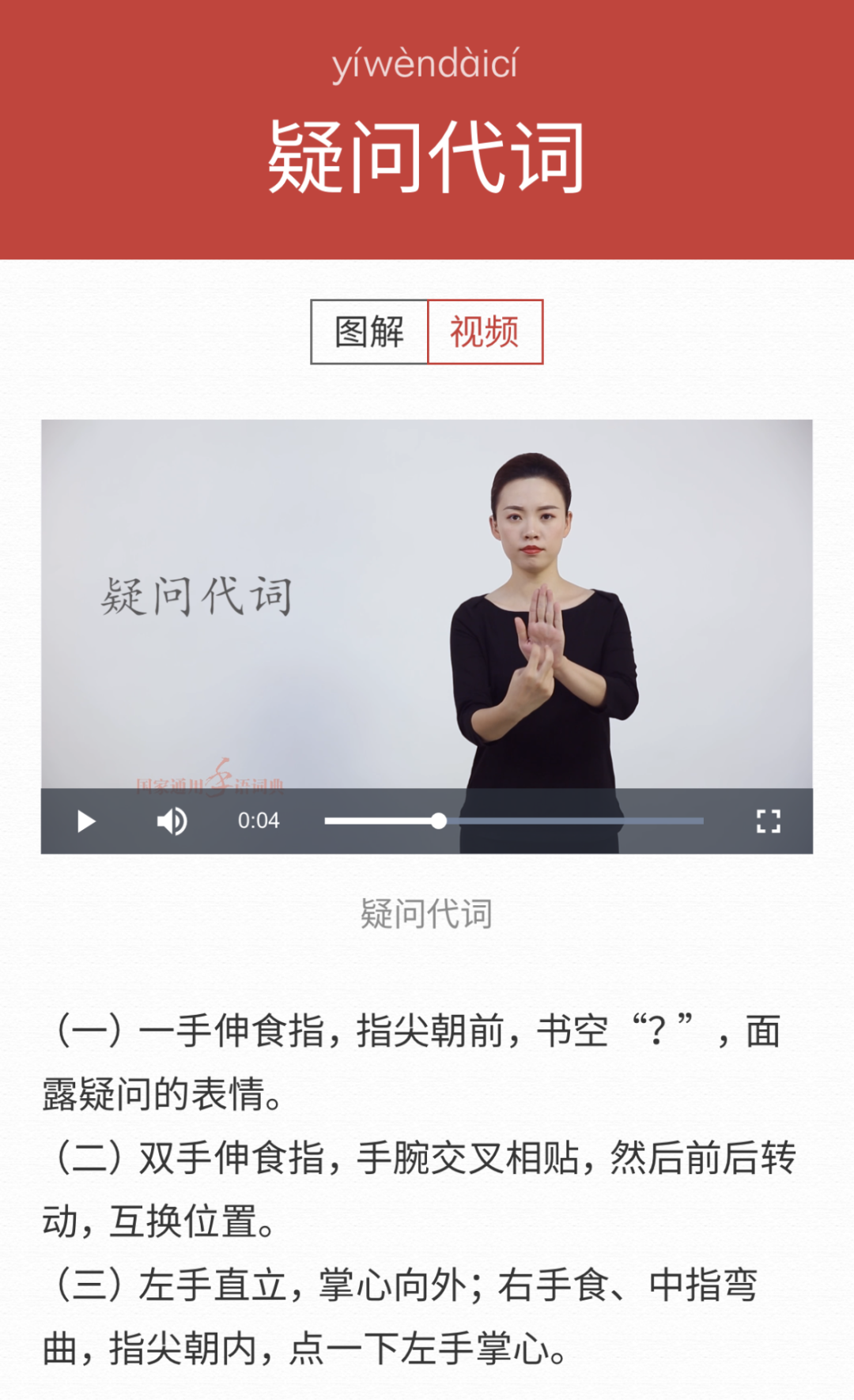 ▲国家通用手语词典应用程序手语讲解疑问代词示例(图片截自国家通用手语词典APP)