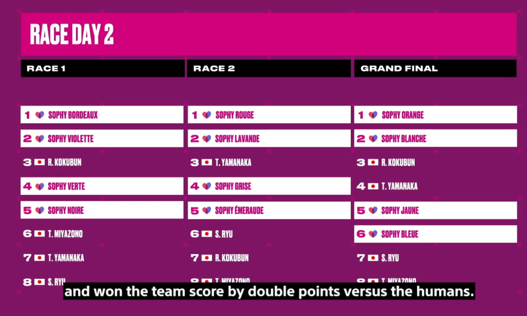 而在四个Sophy与四位人类车手角逐的第二个比赛日中,AI们的优势进一步扩大了——几乎达成了对顶级人类玩家的碾压。