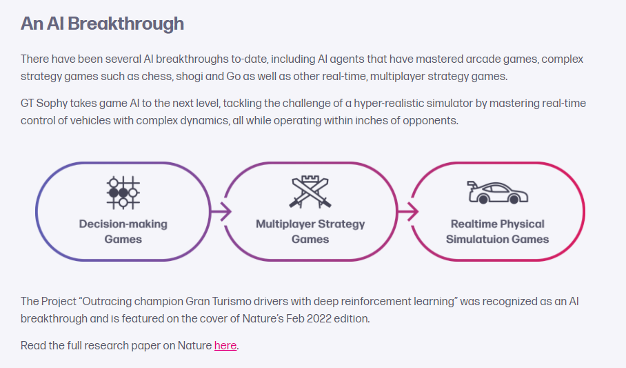 曾经取得三次GT锦标赛世界冠军的车手宫园拓真在与AI的对抗中落败后说,“Sophy采取了一些人类驾驶员永远不会想到的赛车路线……我认为很多关于驾驶技巧的教科书都会被改写。”